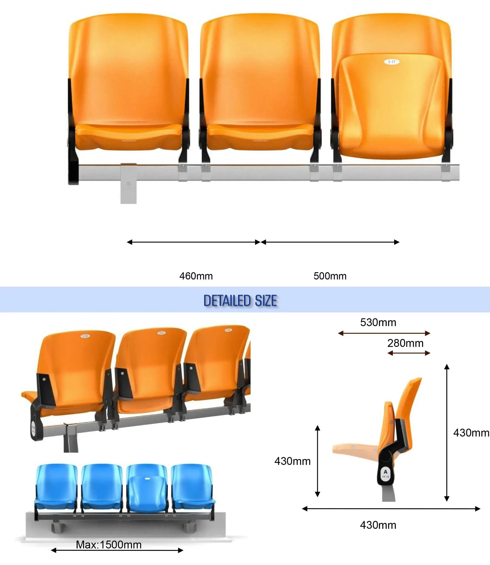 Jedno z nejoblíbenějších sedadel dostupných z naší rozmanité nabídky Max Seat. Integrovaný ergonomický design poskytuje vynikající pohodlí a zajišťuje dlouhodobou životnost. Systém upevnění s nosníky, který Max Seat používá, umožňuje dosáhnout individuální a flexibilní kapacity publika. Sedadla jsou v každé řadě rovnoměrně rozmístěna v závislosti na různých akcích a lze je snadno přidávat, odstraňovat nebo měnit jejich rozmístění.